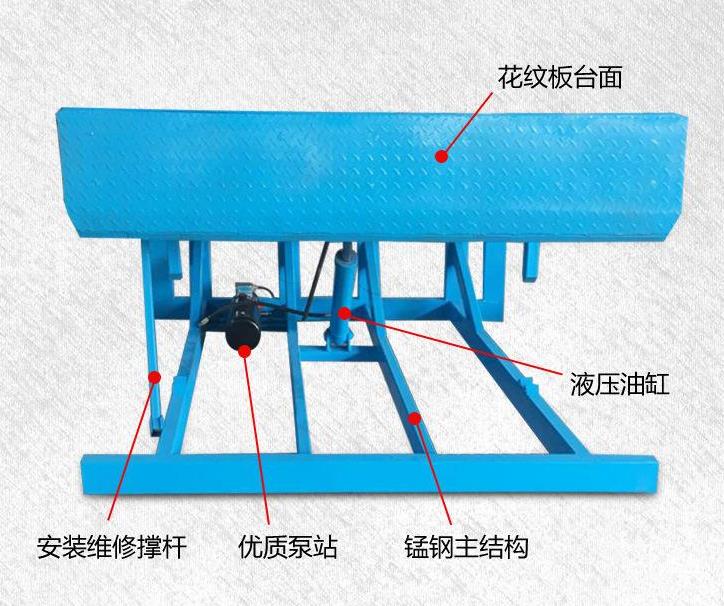 2、通過動力系統,大油缸升起整個斜板,至頂位時,小油缸開始工作,順暢伸出活頁搭板, 高度調節板全部采用濟南濟鋼高度花紋鋼板及型材緊密焊接,壽命長久.