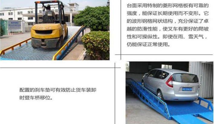 功能:方便卸貨,穩(wěn)定性強(qiáng),維修成本低。適用于裝卸場地上各種車輛以及交通相對(duì)繁忙的場所。 裝卸平臺(tái)、升降平臺(tái)、卸貨平臺(tái): 防溜車裝置:該裝置是由鋼板焊接而成的,可有效地實(shí)現(xiàn)防滑的功能。
